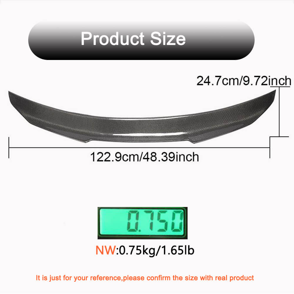 Ahacarbon carbon fiber rear spoiler for Audi A5 B9 Base / Sline S5 RS5 Coupe 2017-2023, is made from Genuine Molded Carbon Fiber Spoiler. You can add a sporty look to your Audi A5 B9 Base / Sline S5 Coupe with our carbon fiber spoiler wing. We are very proud to offer you carbon fiber molded trunk spoilers. Following the line curvature of your A5/S5 Coupe trunk hatch the spoiler has a better profile that gives your Audi an added performance aesthetic, dramatically improve styling. We designed our rear trunk spoiler also to help improve the aero efficiency of Audi A5 B9 Base / Sline S5 RS5 Coupe. Using the latest in aero simulation and CAD technology, we engineered a spoiler that looks great, our trunk wing spoiler is simple to install (no drilling) just with double sided tape, doesn't impede the rearward visibility of a driver, and most-importantly, reduces overall drag and increase rear downforce (helping to improve stability at speed)!