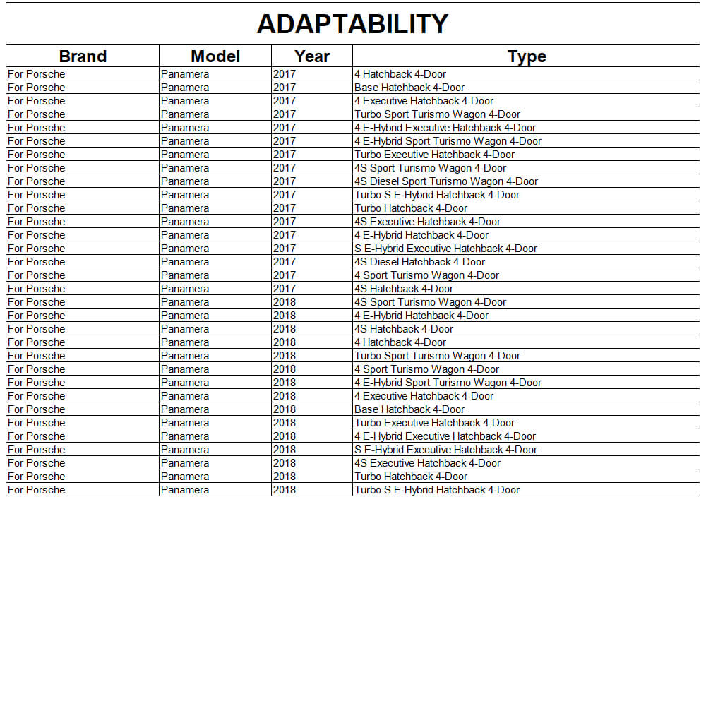 - Model: for Porsche Panamera 971 Hatchback/Wagon (Panamera 4/Panamera Base/Panamera 4 E-Hybrid Sport Turismo/Panamera 4 Executive/Panamera 4S/Panamera Turbo Sport Turismo/Panamera 4S Diesel/Panamera 4S Sport Turismo/Panamera Turbo S E-Hybrid/Panamera 4S Executive/Panamera Turbo/Panamera Turbo Executive/Panamera 4S Diesel Sport Turismo/Panamera 4 E-Hybrid Executive/Panamera 4 Sport Turismo/Panamera S E-Hybrid Executive/Panamera 4 E-Hybrid/Panamera Turbo S E-Hybrid Executive/Panamera 4/Panamera Turbo S E-Hybrid Sport Turismo/Panamera GTS/Panamera GTS Sport Turismo)